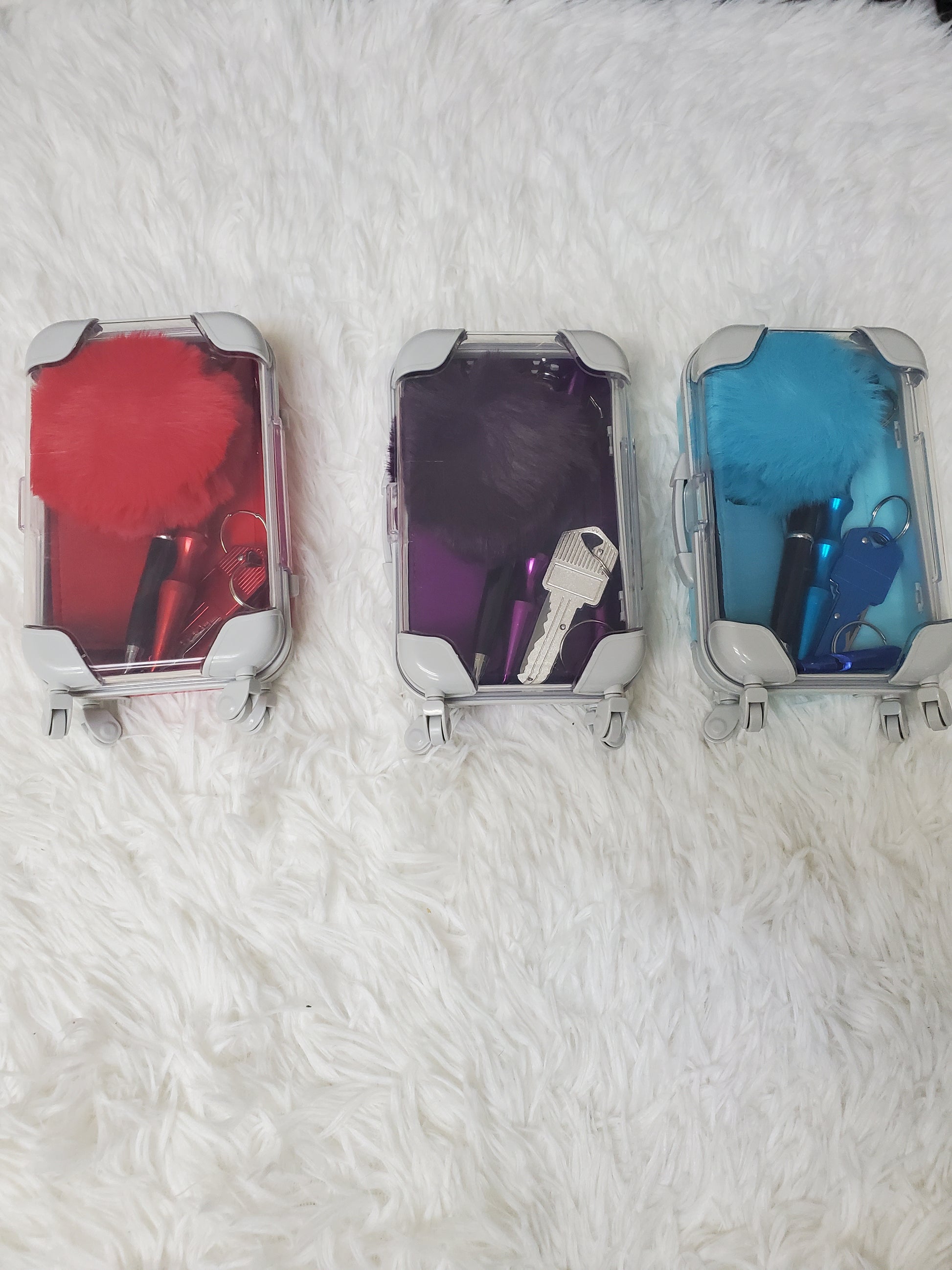 Mini suitcase includes: mini suitcase,kubaton, wristlet, lip gloss holder, lipgloss, pom pom, key knife, pen knife and whistle.